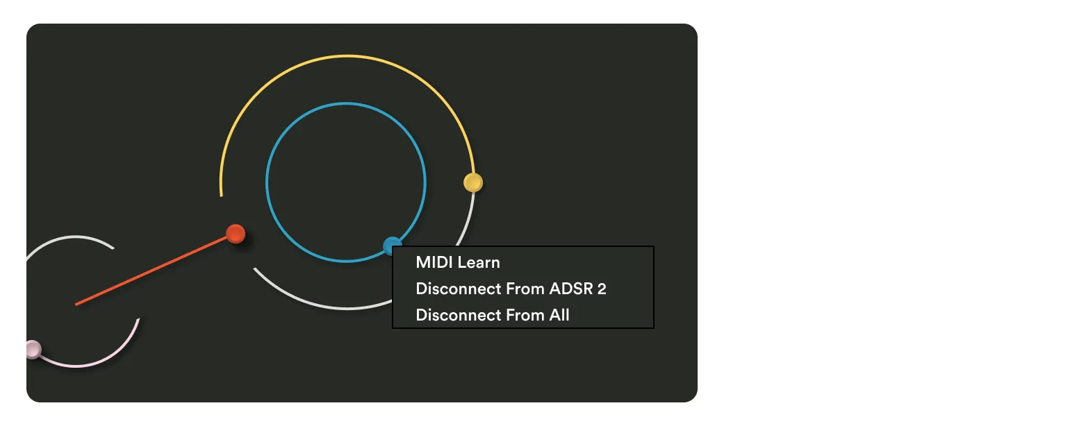 Section titled “Patch Overview”To see which parameters you’ve patched hover over one of the Envelope/UFO icons. The patches are color coded so you can easily see which parameters are being affected by what.