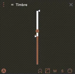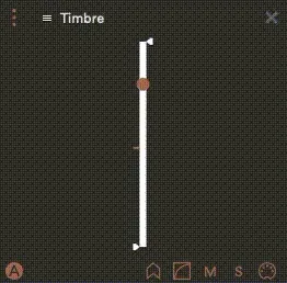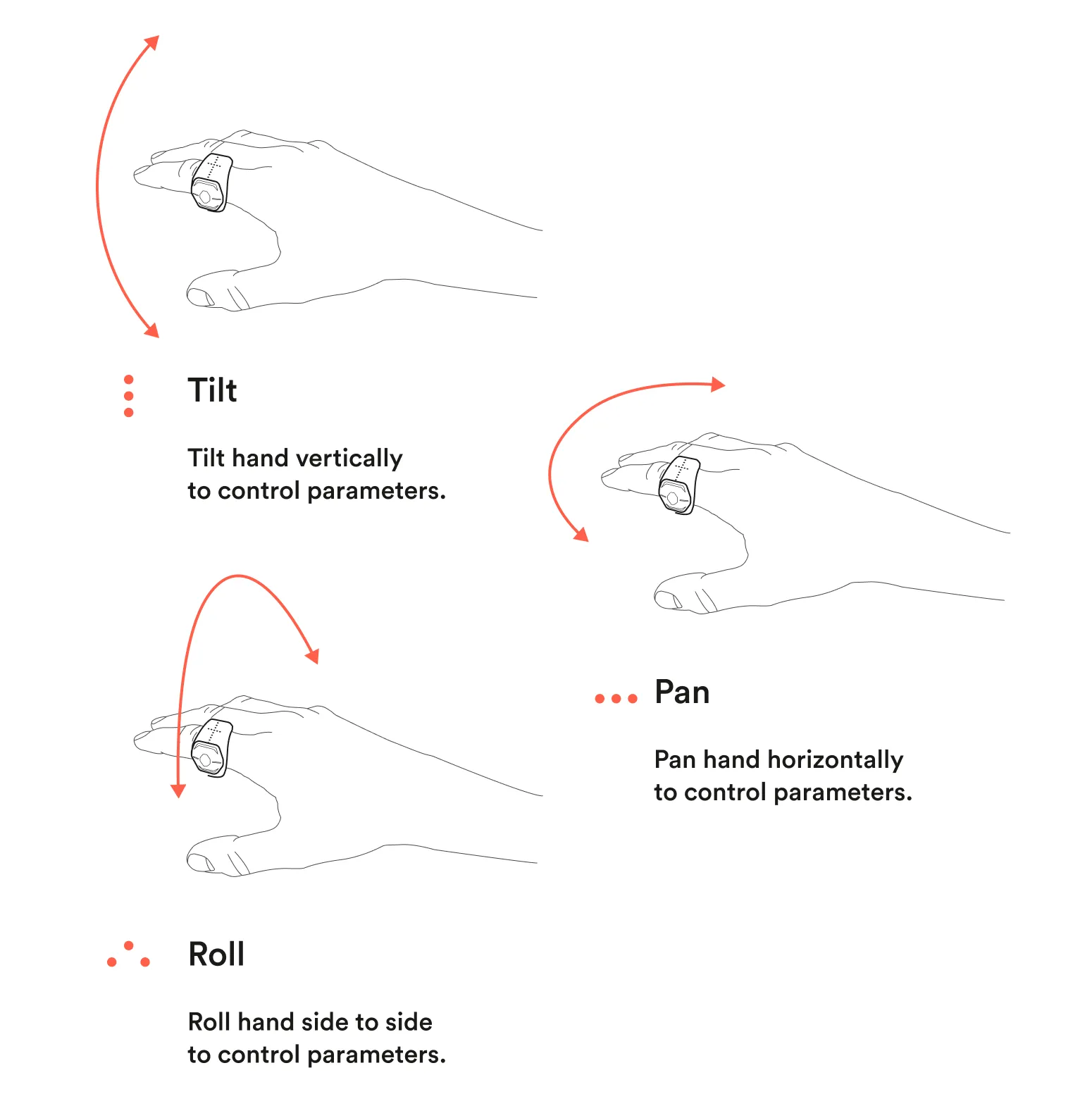 Tilt, Pan and Roll allow you to control parameters in a new way. Tilt is the orientation of Wave vertically, Pan horizontally and Roll the rolling of Wave to its side. These movements can easily replace sliders and rotary knobs, allowing you to control all three axes of Wave at the same time.The current state of a movement is indicated by the brown circle on each slider.