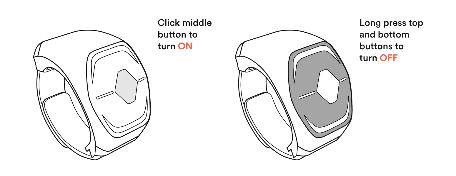 To turn Wave on, toggle the Middle button on Wave. Lights should appear on top of the ring. To turn Wave off, hold the Up and Down button on Wave simultaneously until the lights on the ring turn off.