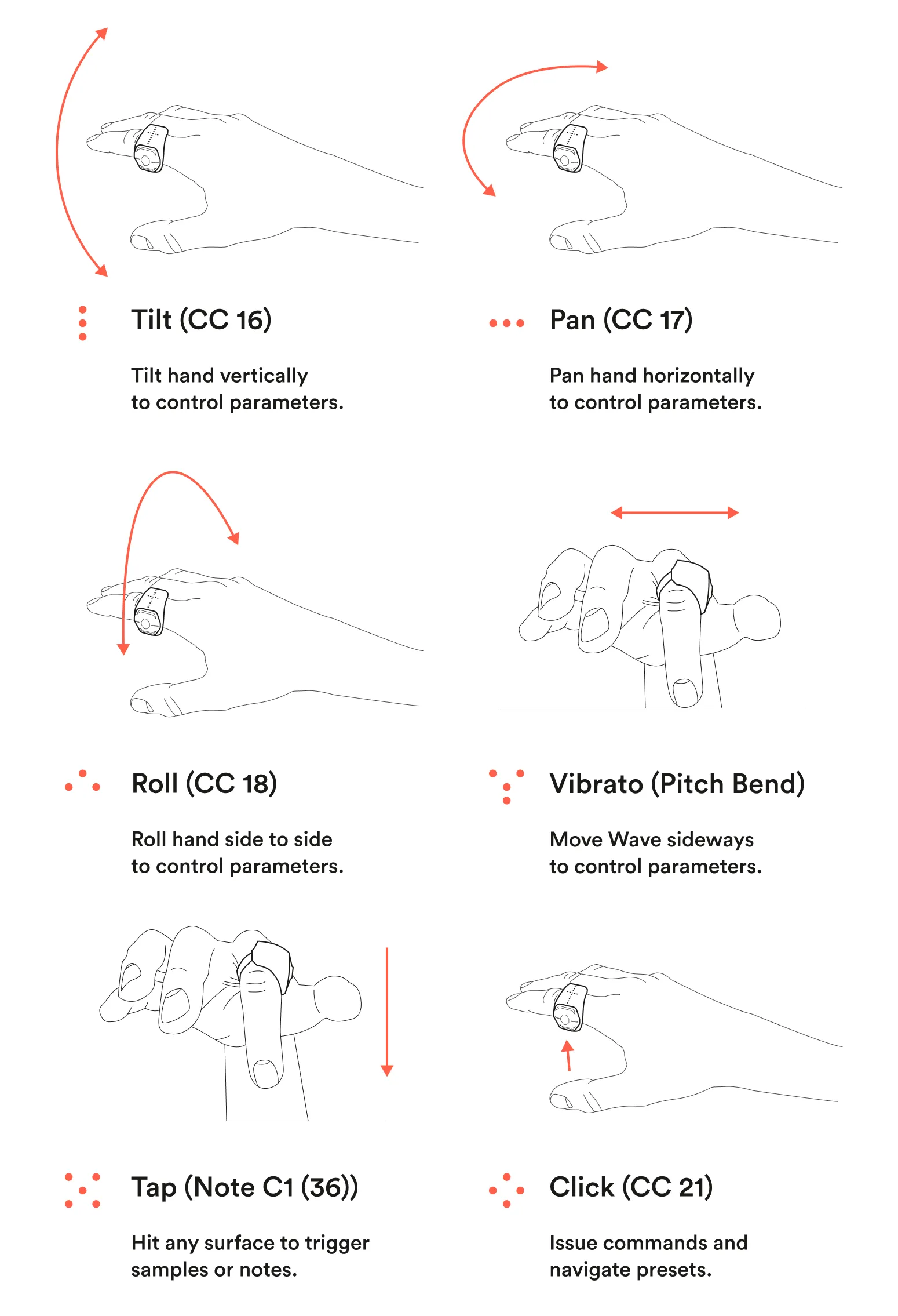 As a default Wave only has one preset in Standalone mode and the CC numbers Wave sends, and each movement’s range is predetermined.