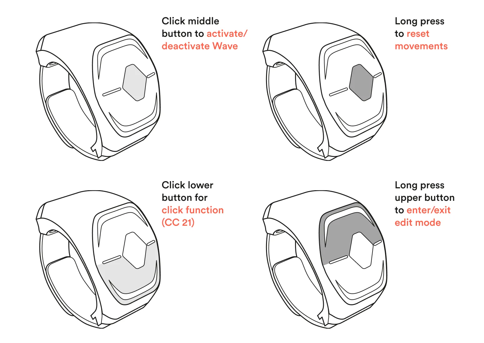 Section titled “Default button settings”Wave has 3 buttons you can reach with your thumb. Each button has a certain function.
