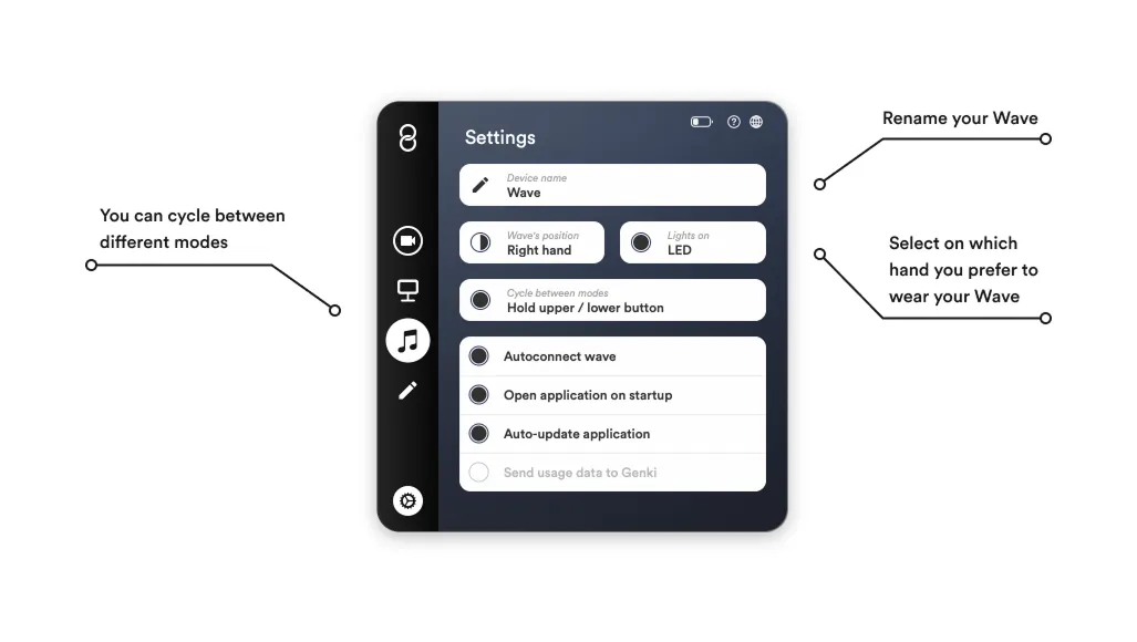 Wave’s position: Choose between “Right hand” and “Left hand” based on which hand you use to wear your Wave. This feature rotates the LED display 180°.