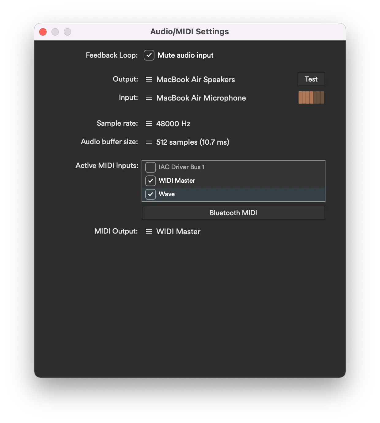 - In Softwave’s Audio/MIDI Settings window, select Wave and WIDI Master as Active MIDI Input.